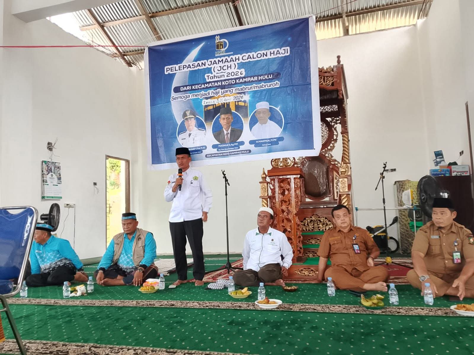 SuaraAura.com – Suasana haru dan penuh doa menyelimuti halaman Masjid Baiturrahman, Desa Persiapan Tanjung Jaya, Kecamatan Koto Kampar Hulu, Senin (20/04/2026). Sebanyak 14 orang jamaah haji asal Kecamatan Koto Kampar Hulu dan Kecamatan XIII Koto Kampar dilepas secara resmi untuk menunaikan rukun Islam kelima ke Tanah Suci.